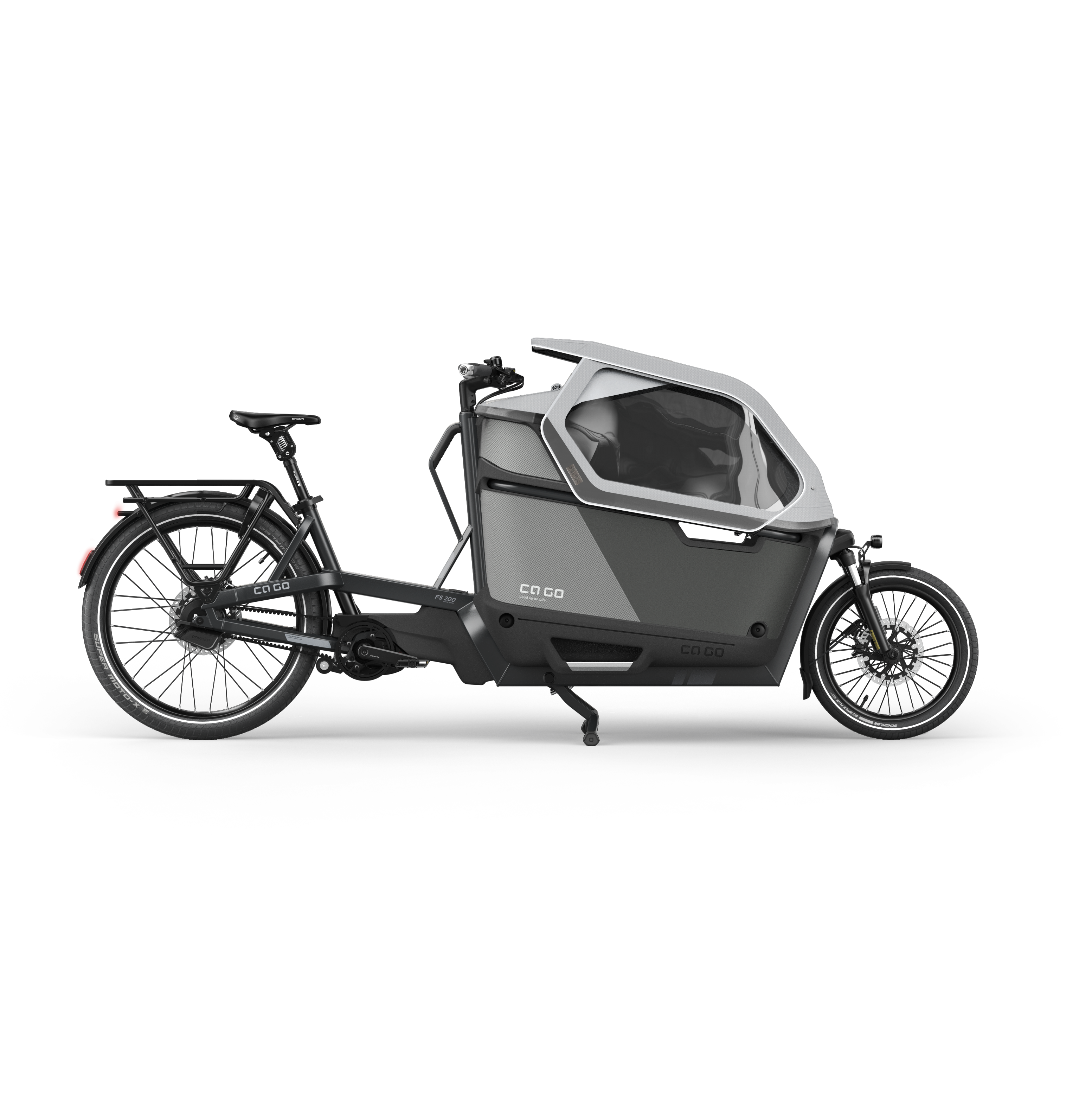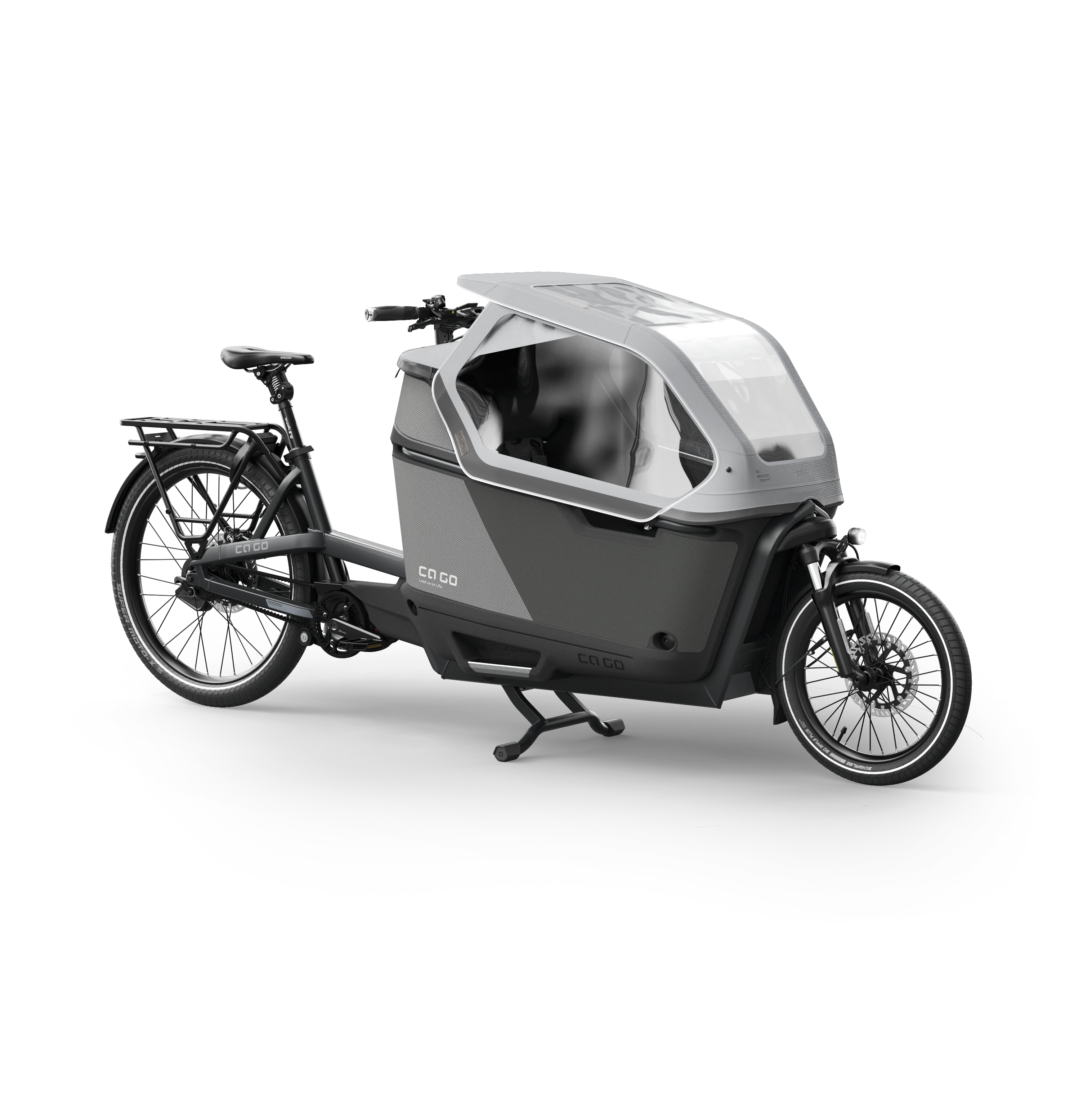 - Das vollausgestattete Familien-Cargobike mit Wetterschutz, höhenverstellbarem Kindersitz, 5-Punkt-Gurt, und, bei Bedarf, Dual-Battery-System und dem neuen Magura IBS-Bremssystem.