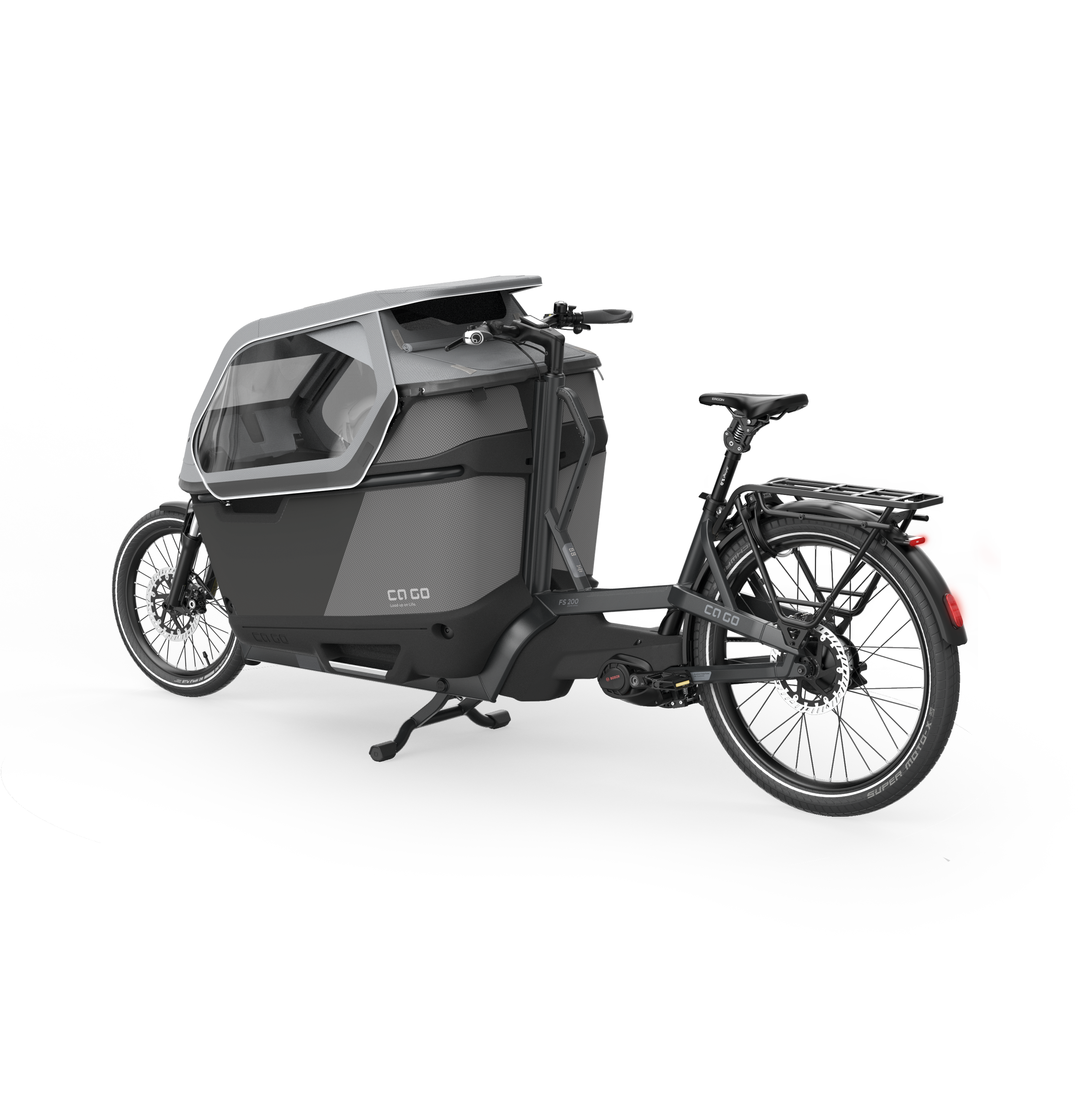 - Familien-Cargobike der Oberklasse: Voll integrierter Wetterschutz jetzt für zwei kleine Passagiere – extra Kindersitz plus Fünfpunktgurt ab Werk, genauso das Abus-Rahmenschloss und die Highend-Beleuchtung inkl. Bremslicht von Supernova. Neues Design für das Schutz-Cover um die Transportbox inkl. des Schutzkragens.